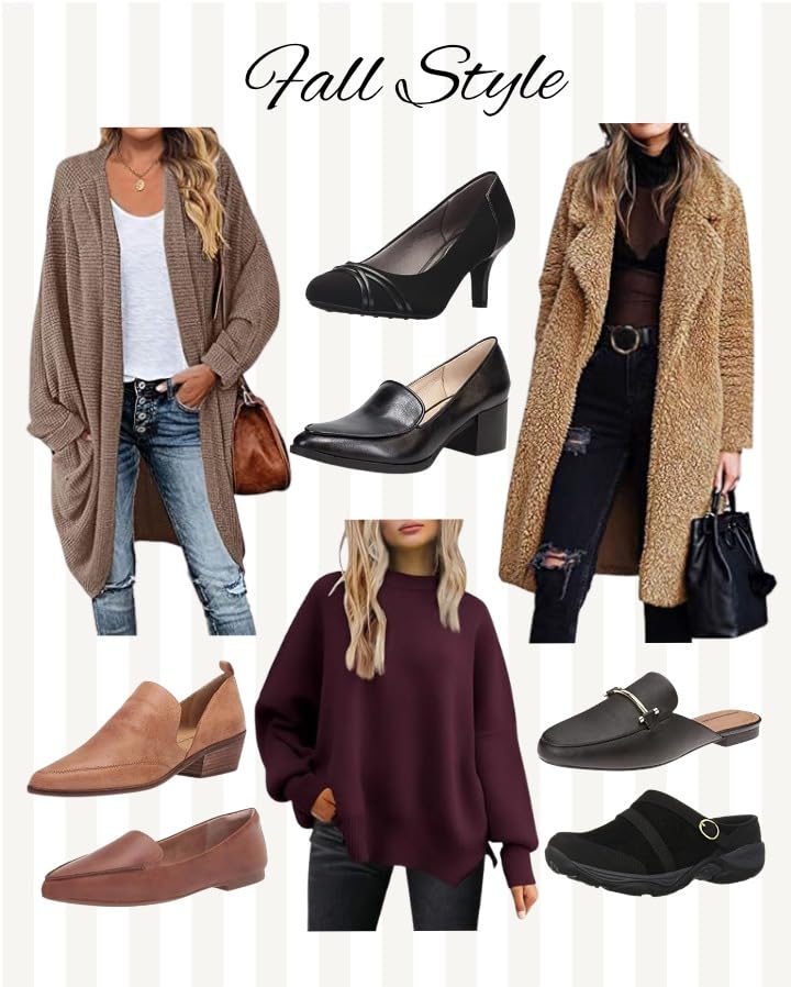 Fall fashion ideas for women. Sweaters, coats, cardigan, pumps, mules, loafers and clogs.
